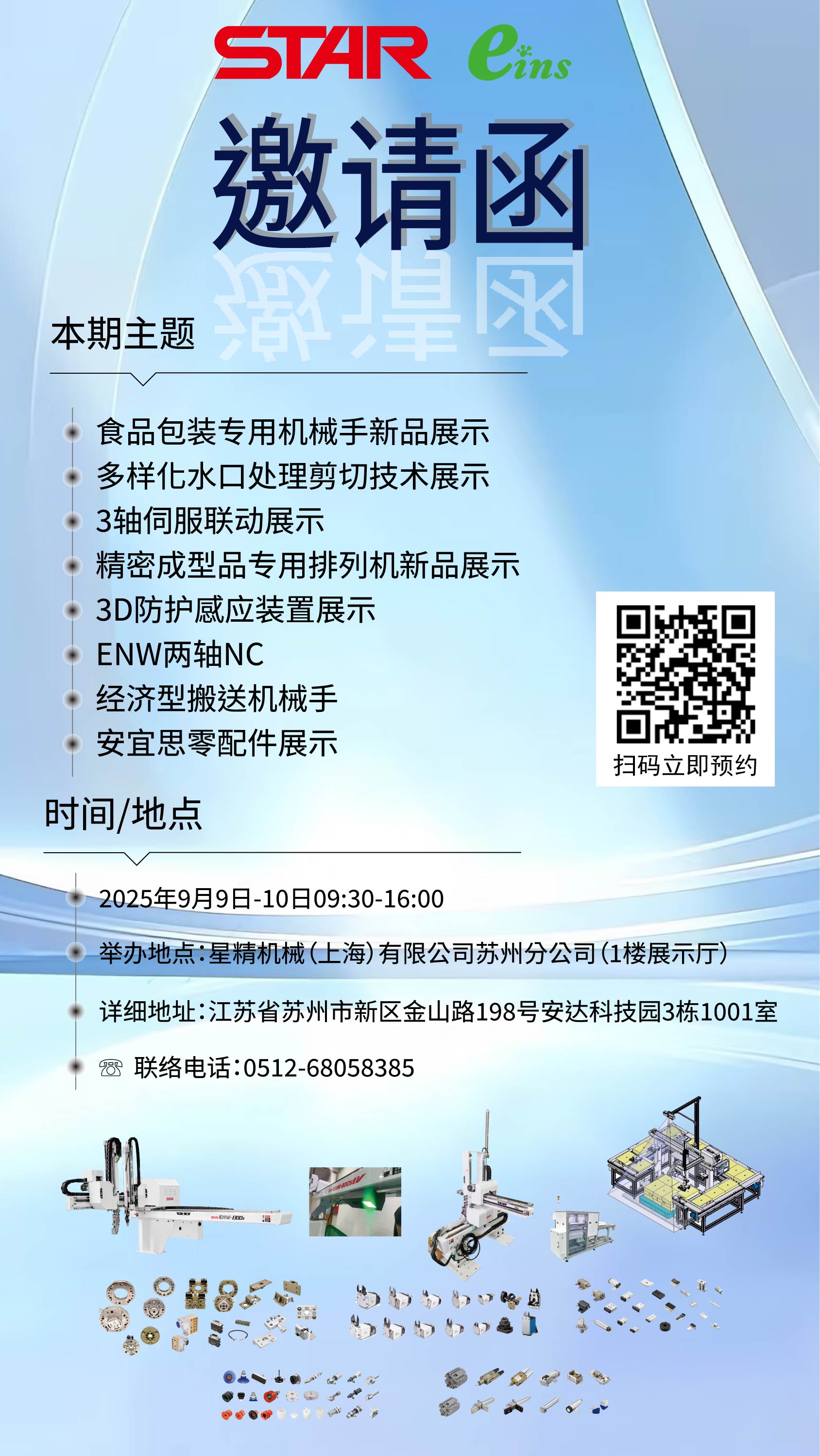 前沿的自動化技術與精良的機械裝備總是能為產業發展注入新活力STAR將帶來一場干貨滿滿的展示活動:食品包裝專用機械手新品展示多樣化水口處理剪切技術展示3軸伺服聯動展示精密成型品專用排列機新品展示3D防護感應裝置展示ENW兩軸NC經濟型搬送機械手安宜思零配件展示
